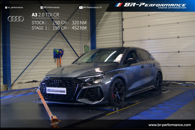 A3 tdi 150 cv dsg6 de 2013 passé à 195 cv et 449 nm !!! anti patinage déclenché sur 3 premiers rapports ( même pas en mode sport !!!!) une tuerie !!! Une équipe BR PERFORMANCE AiX au top !!!