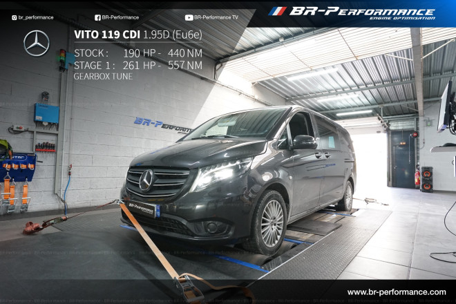 Optimisation du stage 1 sur mon Vito 2024, 119 avec transmission intégrale, passé de 190 chevaux à 267 chevaux, un véhicule qui marchait déjà bien, maintenant il marche très bien, très bon rapport de puissance et de qualité d'accélération malgré le poids du véhicule, troisième expérience avec BR performance de Lyon, une équipe au top, merci